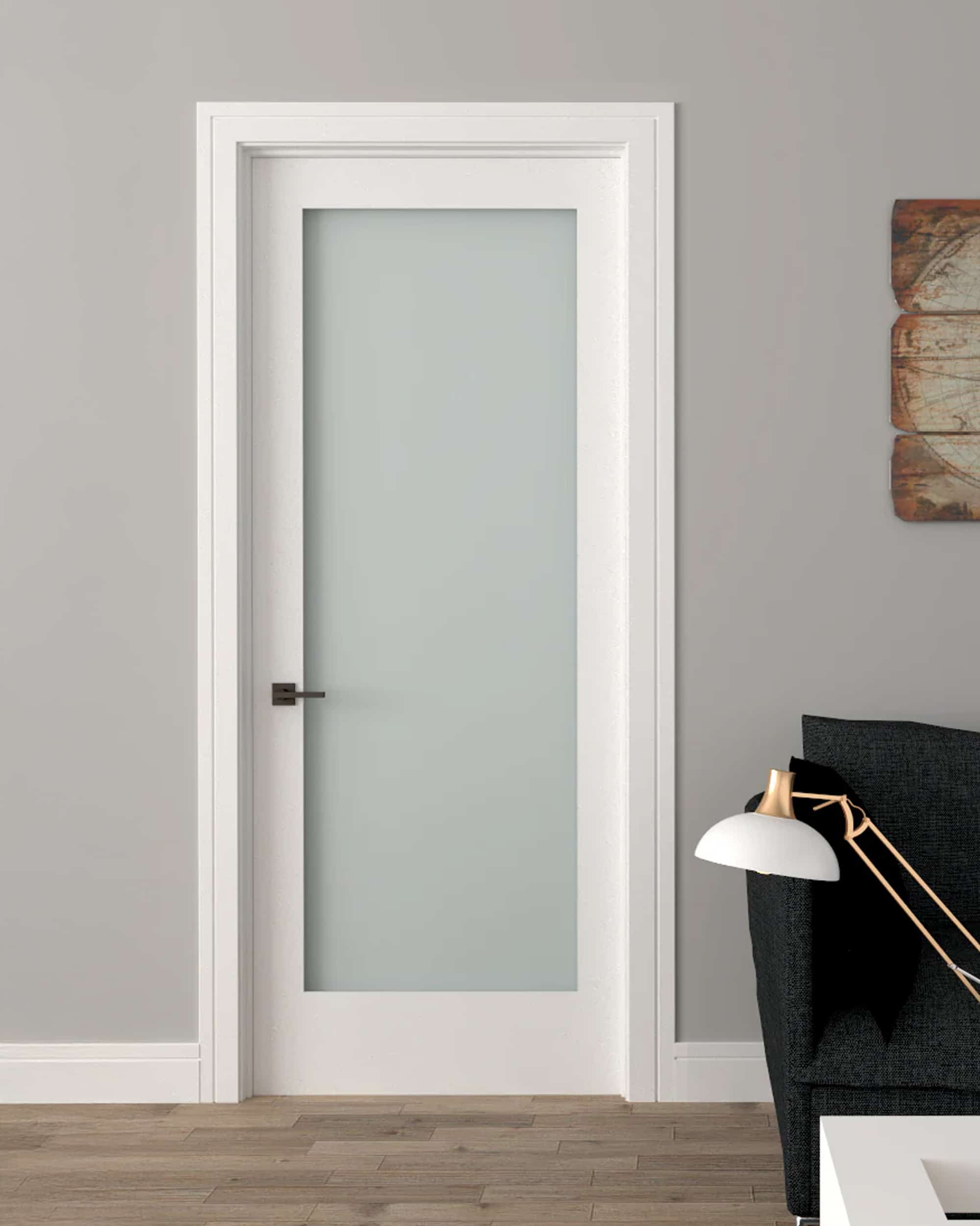 A clear glass insert replaces the center panel for added light flow between rooms. The Shaker frame keeps the minimalist aesthetic while the tempered glass enhances safety. Ideal for kitchens, offices, and shared living spaces.